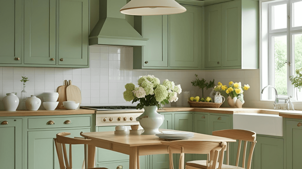 Tủ bếp màu sage green phối cùng bàn ăn gỗ và lọ hoa tươi mang lại cảm giác tươi mới