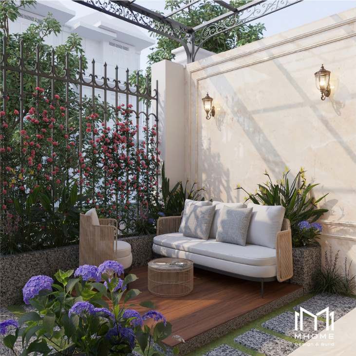Bên ngoài, ngôi nhà phố 3 tầng 6x19m được bao quanh bởi một khu vườn nhỏ xinh xắn. Với sân vườn được trang trí cây xanh và hoa lá, cảnh quan bên ngoài trở thành một nơi thư giãn lý tưởng để cư dân có thể tận hưởng không gian tự nhiên trong lòng đô thị.